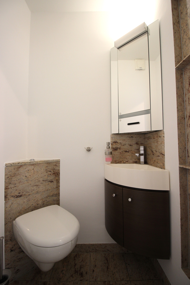 Ein kleiner Zwischenflur trennt Kinder- und Elternschlafzimmer sowie das geschmackvolle, fast luxuriöse Bad mit Badewanne und Dusche mit Echtglasabtrennung und Regendusche sowie Massagedusche vom Wohnbereich ab. Das Bad verfügt außerdem über eine Waschtischmöbeleinheit mit Echtsteinplatte. Außerdem ist hier eine elektrische Fußbodenheizung eingebaut.