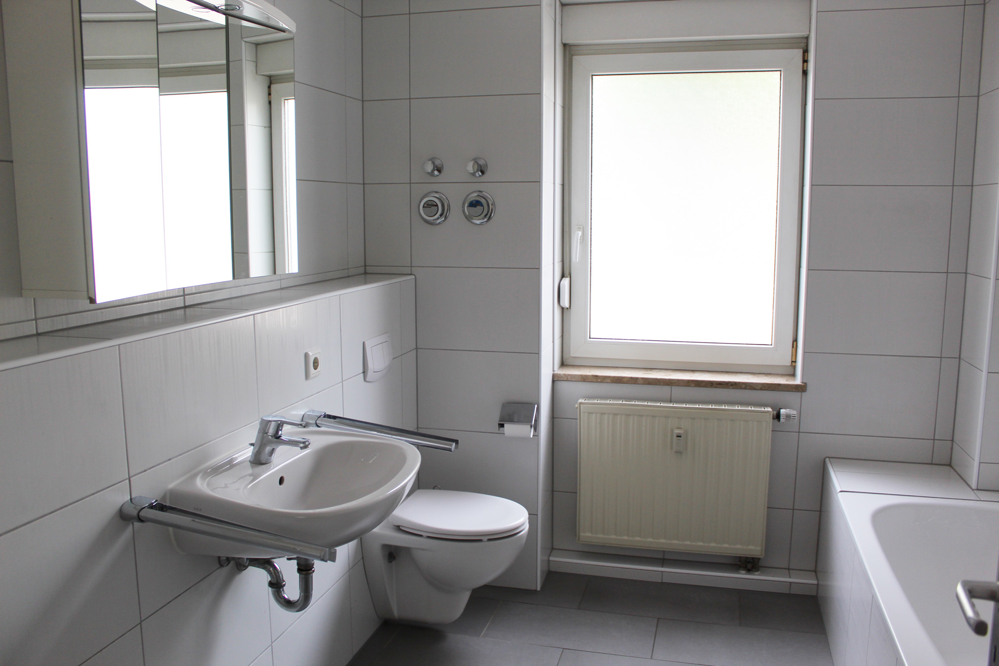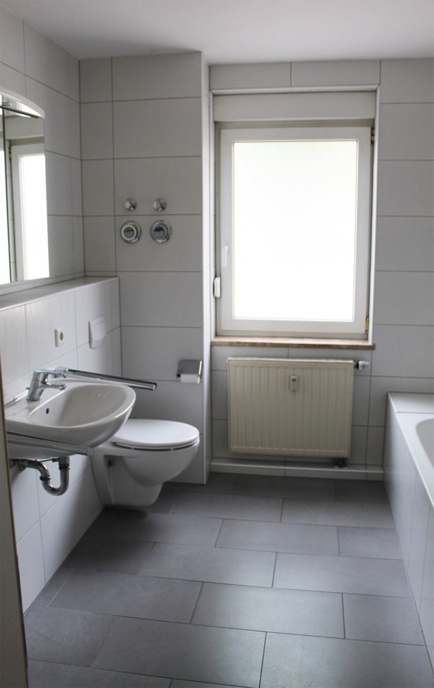 Das Bad ist mit Badewanne, Dusche und großem Fenster ausgestattet. Auch die Waschmaschine wird hier untergebracht. Die modernen großformatigen Fliesen sind - bis zur Decke - in weiß und grau gehalten.