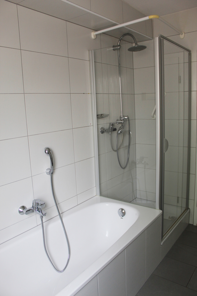 Bad mit Wanne, Dusche mit Glas-Abtrennung, Fenster