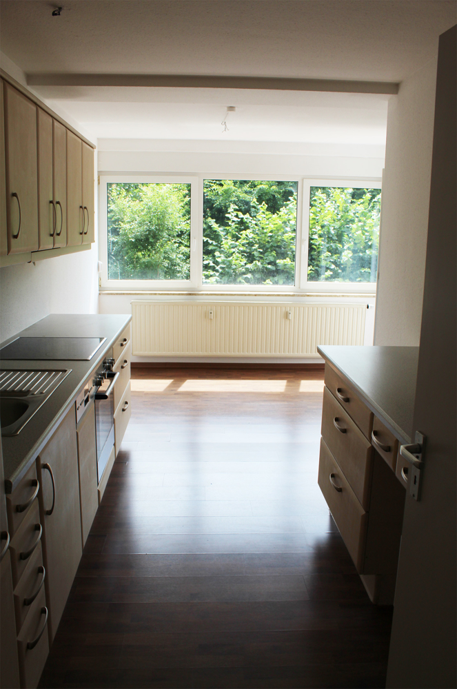 Wohnzimmer und Essbereich liegen auf der sonnenverwöhnten Seite. Eine helle Einbauküche, mit allen technischen Geräten, ist bereits eingebaut und im Mietpreis enthalten. Aufgrund der großen Fensterflächen wirkt die Wohnung hell und freundlich.