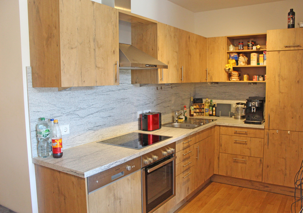 Zur weiteren Ausstattung der Wohnung gehören Spiegelschrank im Badezimmer, eine komplette hochwertige Einbauküche, Vorhänge und Lampen, moderne Bodenbeläge in allen Räumen (Parkett) und ein Abstellraum mit dem Platz für die Waschmaschine.
