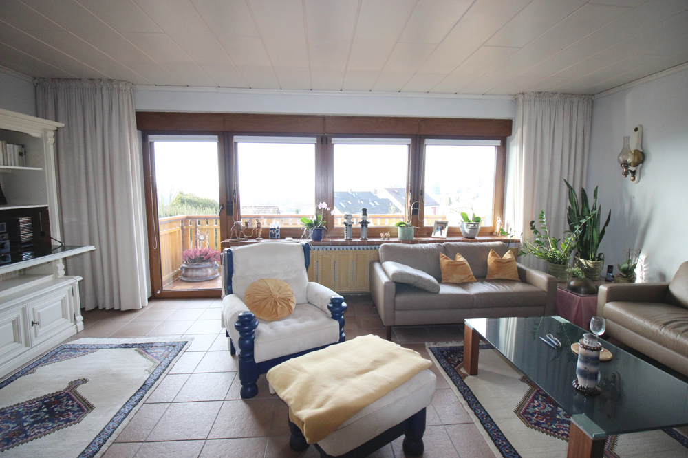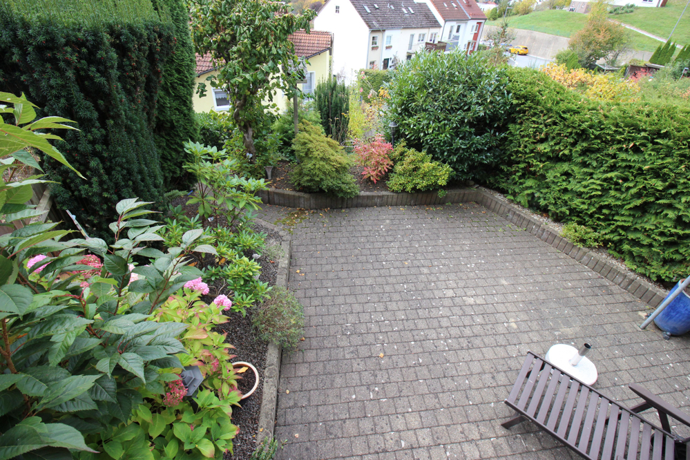 Das Herzstück in dieser Etage ist das Wohnzimmer, das durch Entnahme von Wänden mit dem Esszimmer und der Küche einen großzügigen Raum bildet. Im gesamten Bereich wurde hier eingeschmackvoller und pflegeleichter Fliesenbelag verlegt. Die große Fensterfläche nach Südwesten gibt wiederum den Blick über die Dächer Kulmbachs frei und lässt viel Licht herein. Auch hier kann man auf einen weiteren Balkon hinaus und von dort aus in den Garten bzw. zur Terrasse gelangen. Ein kleiner aber feiner und sehr gepflegter Garten schließt an die Terrasse an.