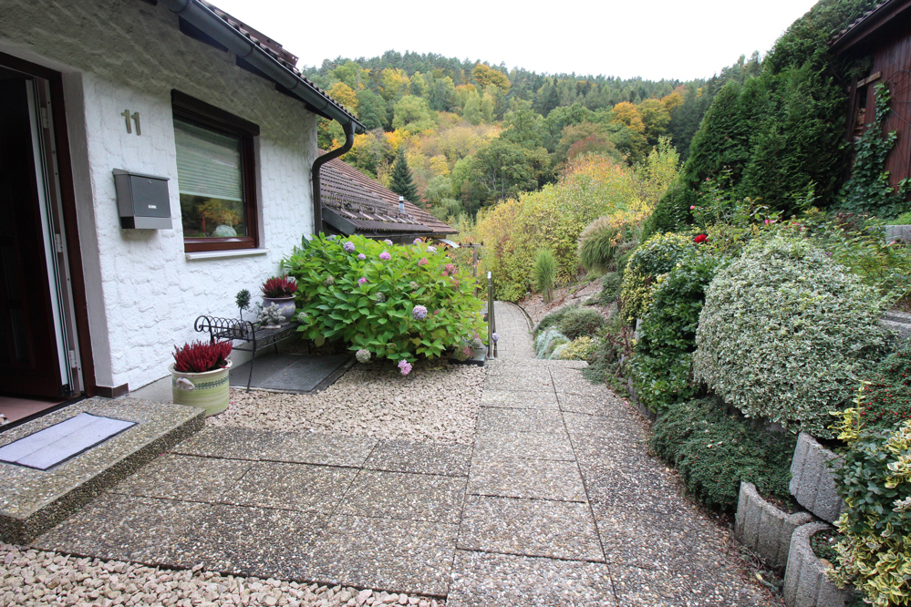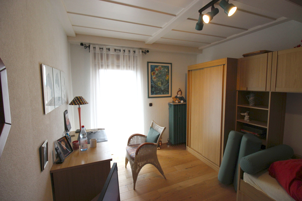 Ein Fußweg mit einigen Treppenstufen führt, entlang an mehereren Reihenhäusern, zu diesem Reihenmittelhaus. Hübsch, idyllisch und Pflegeleicht ist der Vorgarten angelegt. Die Haustüre gewährt Zutritt zum Obergeschoss, was etwas ungewöhnlich sein mag. Neben Windfang und Gäste WC befinden sich hier ein Schlafzimmer und ein Flur, sowie zwei weitere Räume, die als Kinderzimmer genutzt werden können. Der Boden in Windfang und WC ist gefliest, wohingegen in den Schlaf- und Aufenthaltsräumen vor wenigen Jahren durchgehend ein hochwertiger Vollholzparkettboden verlegt wurde. Die beiden nach Südwesten gelegenen Räume verbindet außerdem die Möglichkeit auf einen breiten Balkon hinaus zu treten, wo einen der bereits erwähnte Ausblick erwartet.