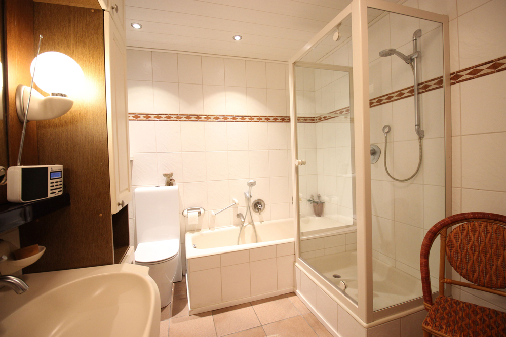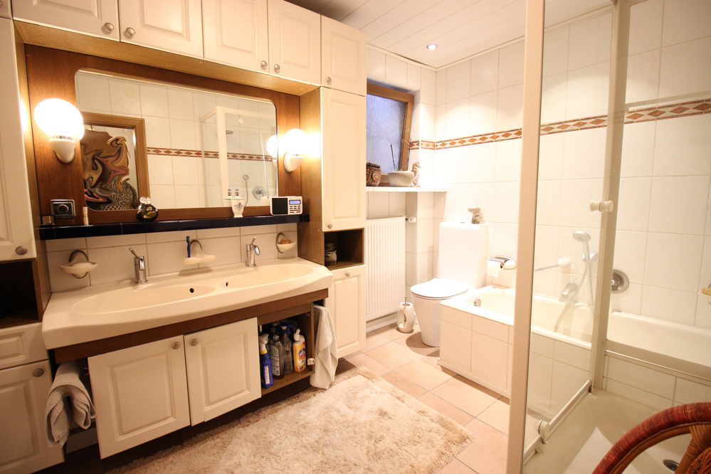 Über das zentral gelegene Treppenhaus hat man nach unten Zutritt in das Erdgeschoss. Hangseitig befindet sich das Badezimmer, das auch bereits eine Modernisierung erfahren hat und jetzt neutral in hellen Tönen gefliest wurde. Dusche, Badewanne, WC und Doppelwaschtisch sind vorhanden.