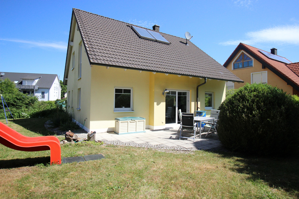Auf insgesamt 610 m² entstand hier ein Wohnhaus mit Keller-, Erd- und Dachgeschoss mit insgesamt 122,55 m² Wohnfläche plus Terrasse. Die Massivbauweise sorgt für Standsicherheit und Schallschutz. Das Wärmedämmverbundsystem an der Fassade zusammen mit der Dachisolierung und den Isolierverglasten Kunststofffenster mit Rollläden sorgen für zeitgemäßen Wärmeschutz.