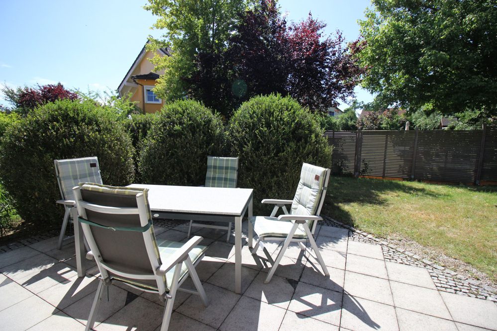 Der Garten ist, wie bereits erwähnt, geschmackvoll und idyllisch angelegt. Die Terrasse in westlicher Ausrichtung ist mit Betonplatten und Natursteinpflaster stilvoll befestigt und damit bestimmt Ihr künftiger Lieblingsplatz!