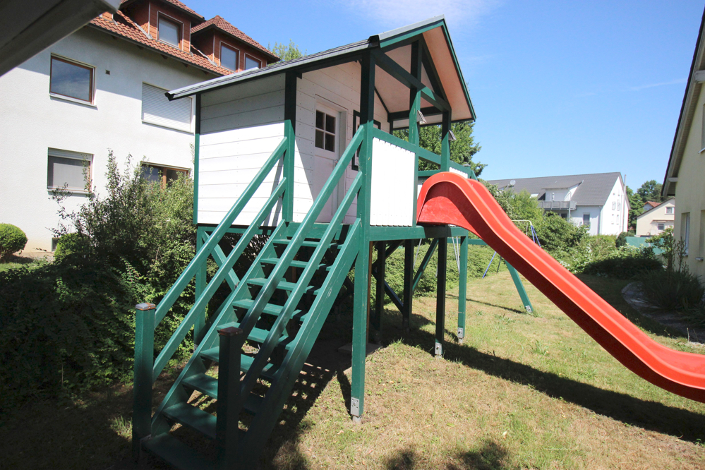 Sie haben Kinder? Das trifft sich gut! Denn ein stabiles, selbst gebautes Kinderspielhaus mit Rutsche und Schaukel steht ebenfalls bereits im Garten und wartet darauf benutzt zu werden.