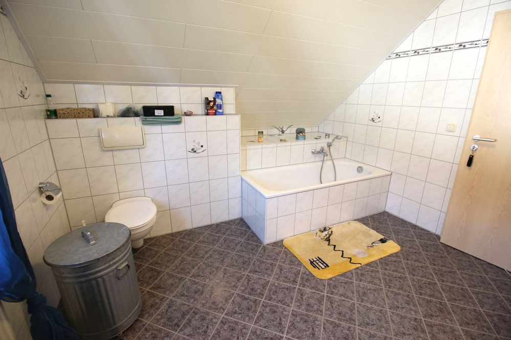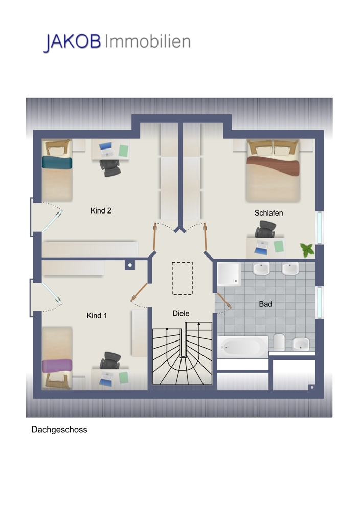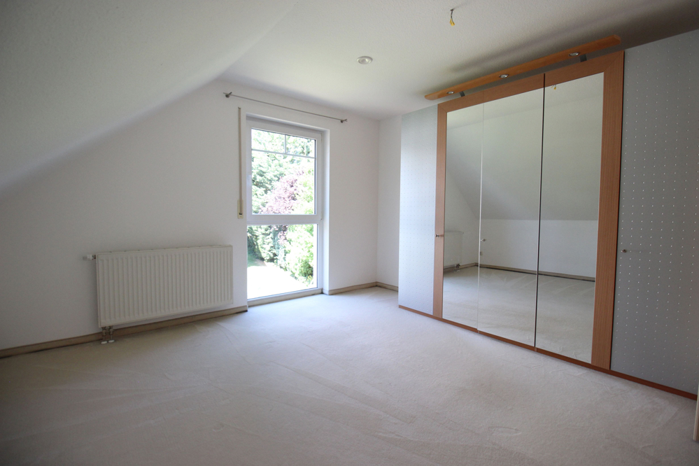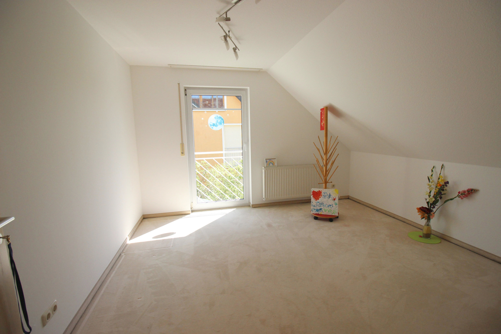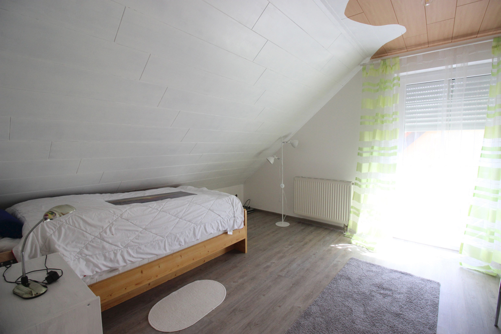 Eine geschmackvolle Massivholztreppe führt in die weiteren Geschosse. Im Dachgeschoss stehen drei ähnlich große Räume zur Verfügung. Kinder- und Elternschlafzimmer haben hier Platz. Alle Zimmer verfügen über einen französischen Balkon, sind hell und mit den schrägen Decken unglaublich gemütlich. Außerdem befindet sich auf dieser Etage das große Badezimmer, das mit zwei Waschtischen, Duschkabine , Badewanne und WC keine Wünsche offen lässt. In der Diele führt eine (wärmegedämmte) Einschubtreppe in den Spitzboden, der auf der ganzen Fläche mit einem Bodenbelag versehen und damit vollständig nutzbar ist.