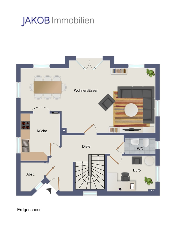 Im Erdgeschoss befindet sich neben der großzügigen Diele, von der man in alle Räume treten kann, ein Büro, ein Abstellraum, ein Gäste WC und die Küche. Das Herzstück auf dieser Etage ist aber das riesige Woh- / Esszimmer. Vier Fenster und eine doppelte Terrassentür bieten Blick in den geschmackvoll angelegten Garten und die Terrasse. Letztere wird von der Bepflanzung im Garten vor den meisten Blicken geschützt und ist zumindest im Sommer eine herrliche Wohnraumerweiterung.