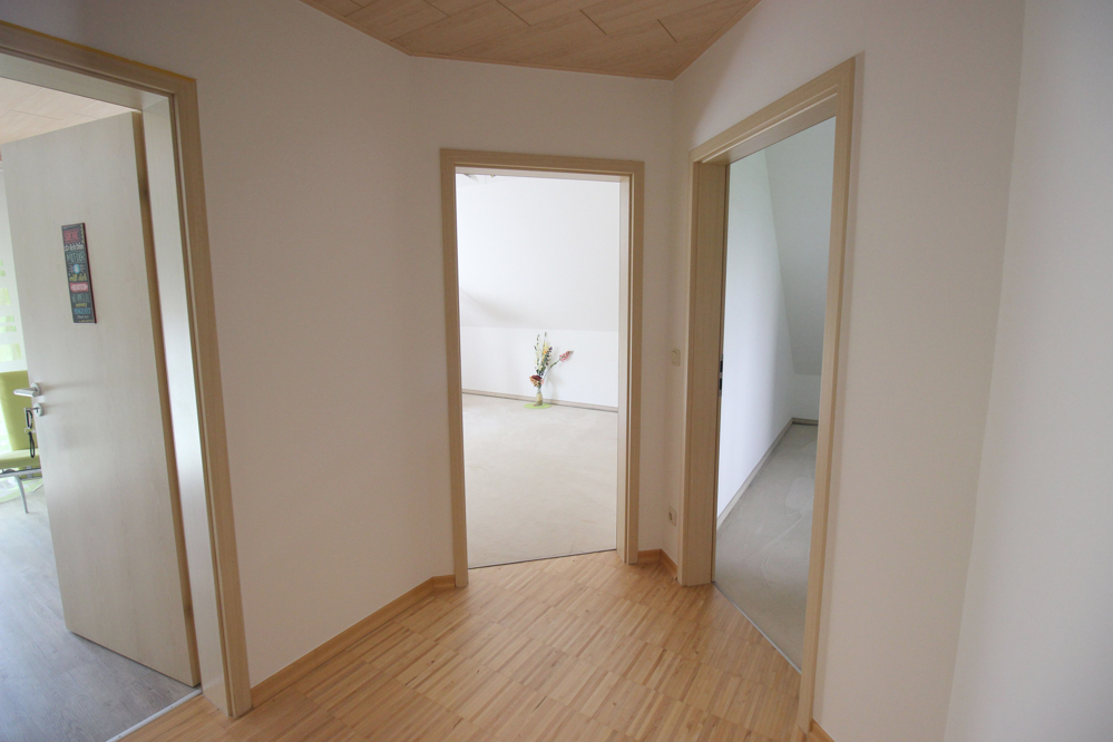 Eine geschmackvolle Massivholztreppe führt in die weiteren Geschosse. Im Dachgeschoss stehen drei ähnlich große Räume zur Verfügung. Kinder- und Elternschlafzimmer haben hier Platz. Alle Zimmer verfügen über einen französischen Balkon, sind hell und mit den schrägen Decken unglaublich gemütlich. Außerdem befindet sich auf dieser Etage das große Badezimmer, das mit zwei Waschtischen, Duschkabine , Badewanne und WC keine Wünsche offen lässt. In der Diele führt eine (wärmegedämmte) Einschubtreppe in den Spitzboden, der auf der ganzen Fläche mit einem Bodenbelag versehen und damit vollständig nutzbar ist.